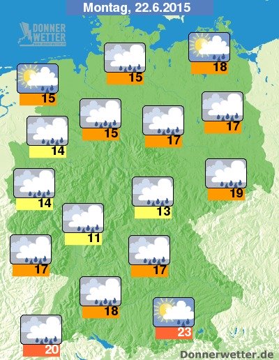 Am Montag bleibt es den Tag über verbreitet stark bewölkt und es zeigen sich nur selten Auflockerungen am Himmel. Dazu fällt immer wieder, oft auch schauerartiger Regen. Im Norden und Westen sind zudem Gewitter möglich. Die Temperatur steigt auf teils nur 11 Grad im Westerwald und bis 23 Grad in München.