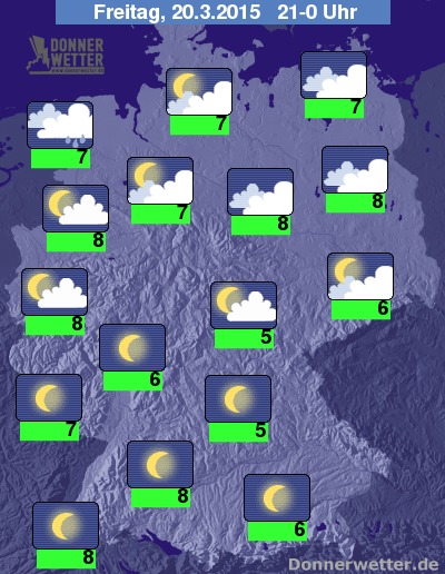 Am Abend bleibt der Himmel nach Süden hin weitgehend sternenklar. Im Norden und Nordosten des Landes halten sich überwiegend dichte Wolken, wobei es hierbei weitgehend trocken bleibt, im Nordseeumfeld kann jedoch zeitweise auch Regen fallen. In den übrigen Landesteilen bleibt es bei wechselnder Bewölkung trocken.