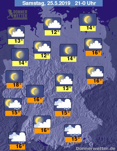 In den Abendstunden dominiert über der Nordhälfte weiterhin ein trockener Mix aus Sonne und Wolken, entlang der Weser kann es auch bedeckt sein. In den späteren Abendstunden klart der Himmel über dem Nordosten sowie im Westen dann vielfach auf. Südlich des Mains bleibt es auch in den kommenden Stunden meist stark bewölkt oder bedeckt und ummer wieder muss mit Schauern gerechnet werden.