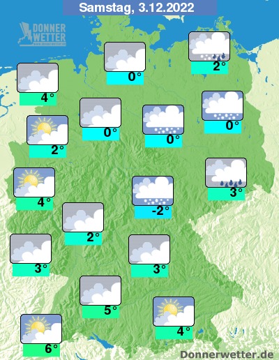 In der Nacht zum Samstag fällt von der Mitte des Landes bis in den Osten gebietsweise Schnee, zum Teil auch Schneeregen oder Regen. Hierbei ist verbreitet mit glatten Straßen durch Schnee oder überfrierender Nässe zu rechnen!! Im übrigen Land ist es ebenfalls meist bedeckt und nur selten zeigen sich Auflockerungen, dazu bleibt es trocken. Stellenweise bildet sich Nebel. Die Temperatur sinkt auf 3 Grad in Bremerhaven und -3 Grad in Jena.