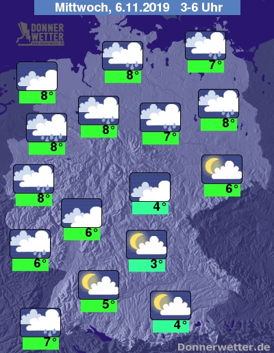 Bis zu den Frühstunden kühlt die Luft auf 2 bis 8 Grad ab, am kältesten wird es in den Gebieten, wo der Himmel für längere Zeit aufklart, am mildesten bleibt es unter den kompakten Regenwolken.