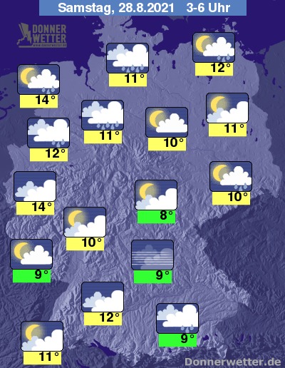 Am Samstag ist es meist stark bewölkt oder bedeckt, dabei bilden sich wiederholt Schauer, örtlich entwickeln sich auch mögliche Gewitter. Jedoch zeigen sich gebietsweise auch Auflockerungen. Die Temperatur steigt auf 15 Grad in München und bis 21 Grad in Berlin.