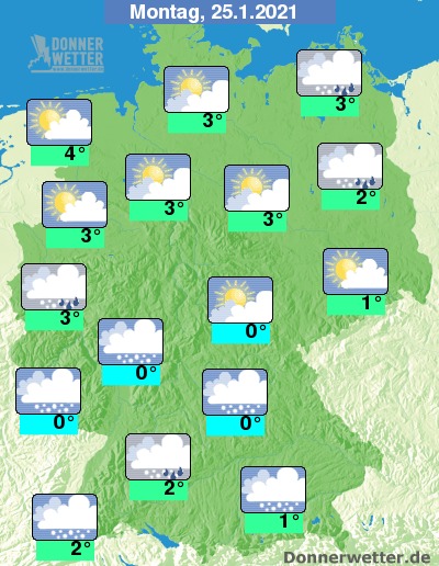 Heute zeigt sich das Wetter im Westen teils heiter bis sonnig und trocken, teils bringen dichte Wolken auch etwas Schnee oder Regen. Im übrigen Land halten sich hingegen dichte Wolken, dabei fällt gebietsweise Schnee, zum Teil auch Schneeregen. Die Temperatur steigt auf 0 Grad im Saargau und bis 4 Grad an der Nordsee.