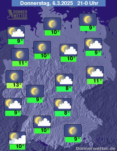 In der Nacht zum Freitag zeigt sich der Himmel südlich des Mains gering oder wechselnd bewölkt, sonst ist es zumeist sternenklar. Es bleibt trocken.