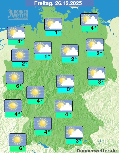 Am heutigen 2. Weihnachtsfeiertag präsentiert sich das Wetter verbreitet heiter oder sonnig. Vor allem über der Nordosthälfte hält sich gebietsweise auch Nebel oder Hochnebel. Es bleibt landesweit trocken. Die Höchstwerte erreichen 0 Grad im Vogtland und bis 6 Grad am Oberrhein.