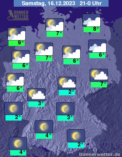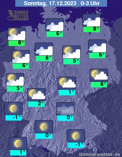 Die Temperaturen gehen im Norden und Nordosten kaum zurück, erreichen hier Tiefstwerte um 8 bis 5 Grad; im Süden Tiefstwerte teils um -1 Grad.