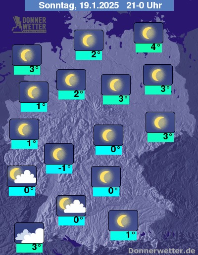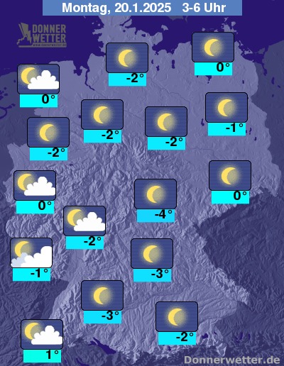 In der Nacht zum Montag ziehen in der West- und Südwesthälfte Wolkenfelder durch, es bleibt aber trocken. In den übrigen Landesteilen ist es sternenklar, in den frühen Morgenstunden kann sich lokal Nebel oder Hochnebel bilden.