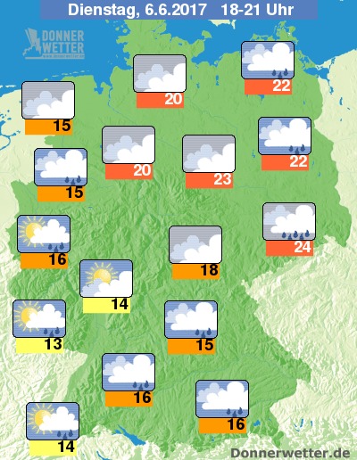 Heute Abend zieht sich der kräftige und teils gewittrige Regen immer weiter in die östlichsten Landesteile zurück, aber auch sonst ist es häufig stark, vor allem im Südwesten und Westen aber auch oft wechselnd bis aufgelockert bewölkt, dabei können sich gebietsweise Schauer und auch einzelne Gewitter bilden. Die Temperatur liegt bei nur 13 Grad im Saargau und bis 24 Grad in der Lausitz.