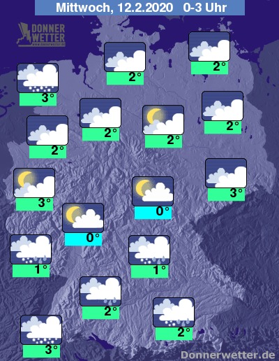 In der Nacht auf Mittwoch lockern die Wolken vor allem in der Mitte und im Westen des Landes gebietsweise auf, sonst bleibt der Himmel überwiegend bedeckt. Mit zeitweisen Schauern, die meist als Schneeregen, Schnee oder Graupel fallen, muss in den Nachtstunden vor allem an den Küsten sowie im Süden Bayerns und Baden-Württembergs gerechnet werden.