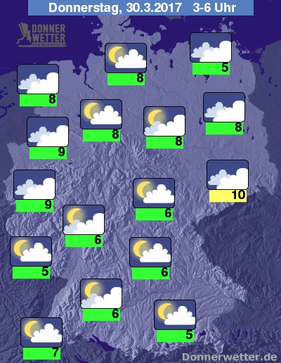 Am Donnerstag morgen steigen die Temperaturen wieder rasch an. Weitgehend in jeder Region über Deutschland zeigt sich die Sonne zeitweise über dem Himmel. Ausgenommen sind die Ostseeküste und die Hauptstadt Berlin, wo es höchstwahrscheinlich noch zu etwas Regen kommen wird. Die Temperaturen liegen bei Werten um 14 Grad C und 20 Grad C in der Eifel.