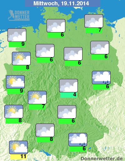 Der heutige Mittwoch wird voraussichtlich nur geringfügig besser als der Vortag, denn es halten sich weiterhin meist viele Wolken am Himmel, wobei die Wolkendecke häufig verschlossen bleibt. Zumindest zieht sich der Regen im Süden und Osten des Landes im weiteren Tagesverlauf immer mehr in den Südosten Deutschlands zurück, hier klingen die Niederschläge erst im Laufe des späten Abends ab. In den anderen Landesteilen bleibt es dagegen weitgehend trocken. Die besten Chancen auf Sonne gibt es im Südwesten, aber auch im Westen und Nordwesten der Republik kann die Bewölkung hier und da etwas auflockern. Die Temperatur steigt auf 4 Grad im Vogtland und bis zu 11 Grad in Freiburg.