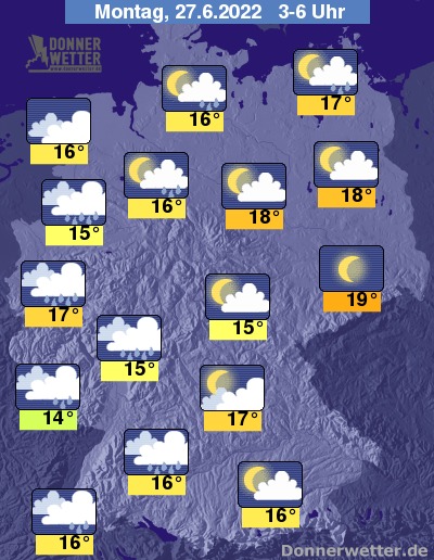 In der Nacht zum Montag ist es anfangs noch meist aufgelockert, über der Osthälfte überwiegend nur locker bewölkt und trocken. Bereits am Abend setzen jedoch im Südwesten Schauer und lokale Gewitter ein, die im Laufe der Nacht nordostwärts ziehen, so dass in der zweiten Nachthälfte über der Westhälfte und im Norden mit Schauern und vereinzelt auch Gewittern zu rechnen ist. Im übrigen Land ist es meist nur locker, teils wechselnd bewölkt, aber weitgehend trocken. Die Temperatur sinkt auf 19 Grad in Dresden und 14 Grad im Saargau.