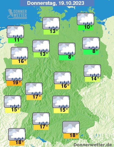 Am Donnerstag bleibt es stark oder dicht bewölkt, dabei fällt zeitweise Regen. Hier und da ist es auch neblig-trüb. Die Temperatur steigt auf nur 8 Grad in der Magdeburger Börde und bis 19 Grad in der Kölner Bucht. An den Küsten weht weiterhin ein zum Teil stürmischer Wind.