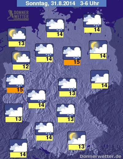 Am frühen Sonntagmorgen machen sich Niederschläge dann nicht nur mehr im Norden der Republik breit; auch im Süden Deutschlands kann es nun immer wieder schauern. Die Temperaturen liegen bei Werten um 15 bis 12 Grad.