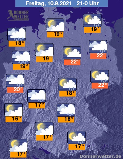In den Abendstunden bleibt es über weiten Landesteilen bei einem Mix aus heiteren Himmelsabschnitten und wechselnder, vornehmlich im Westen und der Mitte später auch starker Bewölkung. Dabei muss verbreitet mit einzelnen Schauern und Gewittern gerechnet werden, weiterhin örtlich mit Unwetterpotenzial. Weitgehend trocken bleibt es bis Mitternacht in erster Linie im Südwesten.