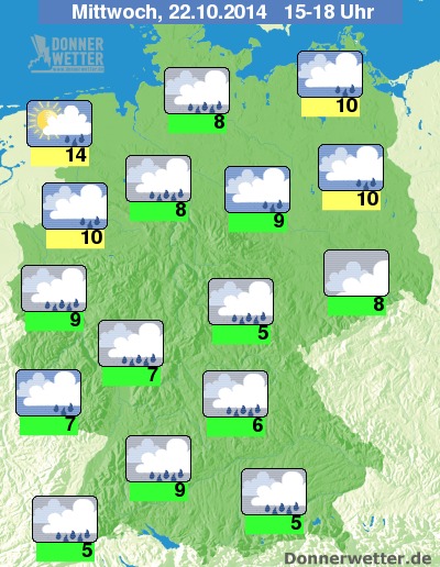 Am Nachmittag ziehen häufig dichte Wolken durch, die für teils kräftige, und vor allem im Osten und Süden auch langanhaltende Regenfälle sorgen. Im Westen, aber gebietsweise auch im Norden lockert die Bewölkung meist etwas auf, es können sich jedoch weitere, teils kräftige Schauer entwickeln. Dazu weht im Flachland ein frischer bis starker Wind mit regional stürmischen Böen. Auf den Bergen und an der Nordsee weht der Wind meist stark bis stürmisch, dabei sind auch schwere Sturmböen möglich. Die Temperatur liegt bei teils nur noch 5 Grad am Alpenrand und bei 14 Grad an der Nordsee.
