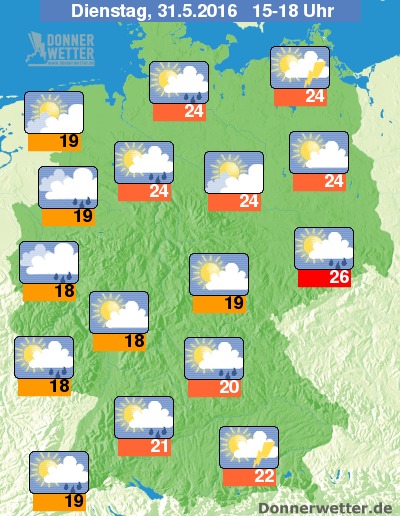 Heute Nachmittag kann sich zwischen den teils dichten Wolken auch immer wieder mal die Sonne zeigen, jedoch bilden sich hier und da Schauer und besonders über dem Norden und Osten auch teils kräftige Gewitter. Die Temperatur liegt bei 18 Grad am Pfälzer Wald und um 26 Grad in der Lausitz.