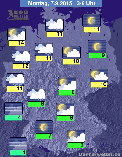 In der bevorstehenden Nacht ziehen im Norden und Westen der Republik verbreitet dichte Wolken mit Regen auf. Die Niederschläge breiten sich im weiteren Verlauf auch bis in die Landesmitte hin aus. Im übrigen Bundesgebiet ist es hingegen oft sternenklar oder nur locker bewölkt, nur hier und da ziehen auch mal dichtere Wolkenfelder durch, dabei bleibt es trocken. Die Temperatur sinkt auf 12 Grad in Papenburg und bis 4 Grad am Oberrhein.
