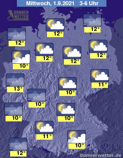 In der Nacht zum Mittwoch zeigt sich der Himmel über Deutschland locker bewölkt und oft auch sternenklar. Hier und da, vor allem über dem Ostseeumfeld, Bayern und Sachsen halten sich auch teils dichtere Wolken, dazu bleibt es trocken. Die Temperatur sinkt auf 13 Grad in der Kölner Bucht und bis 10 Grad in Mittelfranken.