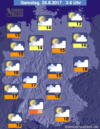 In der Nacht zum Samstag zeigt sich der Himmel über der Nordhälfte des Landes meist leicht bis aufgelockert bewölkt, hier bleibt es trocken. Im übrigen Bundesgebiet ziehen dagegen oft auch dichte Wolken auf und bis aufs südlichen Bayern und Baden-Württemberg bilden sich auch gebietsweise Schauer und auch mögliche Gewitter. Die Temperatur sinkt auf tropische 20 Grad in Stuttgart und bis auf 13 Grad an der Müritz.