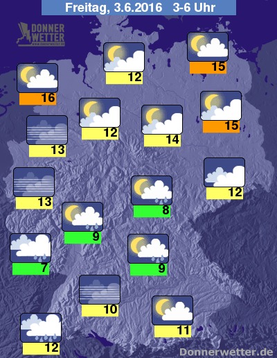 In der Nacht zum Freitag bilden sich vom Saarland bis rüber zum Erzgebirge gebietsweise einzelne Schauer und seltener auch Gewitter. Im südlichen Baden-Württemberg ist es meist bedeckt und es fällt zeitweise auch Regen. Im übrigen Bundesgebiet zeigt sich der Himmel meist locker oder aufgelockert bewölkt und es bleibt zumeist trocken. Die Temperatur sinkt auf 16 Grad in Ostfriesland und etwa 7 Grad am Pfälzer Wald.