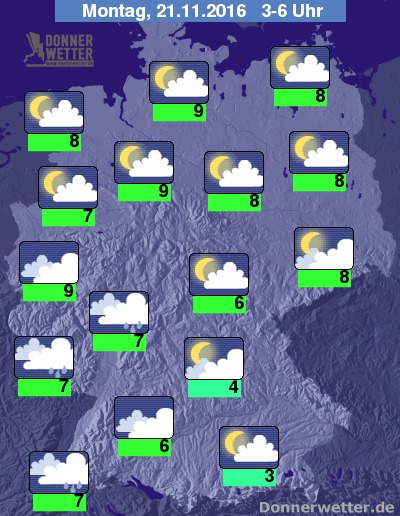 In der bevorstehenden Nacht ziehen über den Südwesten und den äußeren Westen dichte Wolken mit Regen hinweg. Über der Nordhälfte bleibt es hingegen meist nur locker bewölkt, sonst ist es aufgelockert oder stark bewölkt und dazu trocken. Die Temperatur sinkt auf 9 Grad im Rheinland und bis 3 Grad in Rosenheim. Der Wind weht im Norden weiterhin teils stark, an der Nordsee noch verbreitet stürmisch.