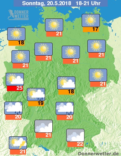 Heute Abend ist es vor allem im Süden überwiegend stark bewölkt und es können sich wiederholt Schauer und einzelne Gewitter bilden. Über der Nordhälfte Deutschlands ist es weitgehend sonnig und trocken. Im übrigen Land ist es meist heiter und trocken. Die Temperatur liegt bei etwa 17 Grad in Rostock und bis 25 Grad in Köln.