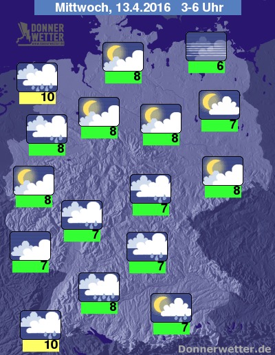 In der folgenden Nacht ist es anfangs im Westen und Südwesten oft dicht bewölkt und es fällt zeitweise Regen, sonst ist es zunächst wechselnd bewölkt, hier und da auch sternenklar und weitgehend trocken. Im Nachtverlauf ziehen auch im Süden dichte Wolken und Regen auf, der sich bis etwa über die Südhälfte hin ausbreitet, weiter nach Norden hin ist es teils stark, teils aufgelockert bewölkt, aber weitgehend trocken. Die Temperatur sinkt auf 10 Grad in Freiburg und 6 Grad in Neubrandenburg.