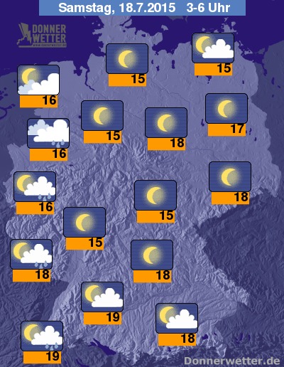 In der folgenden Nacht zeigt sich der Himmel vielerorts sternenklar, zunächst bilden sich aber im Süden und Osten, in der zweiten Nachthälfte dann eher im Westen und Norden gebietsweise Schauer und einzelne Gewitter, zumeist bleibt es jedoch trocken. Die Temperatur sinkt auf 19 Grad im Breisgau und bis 15 Grad am Westerwald.