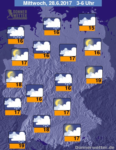 In der kommenden Nacht ziehen überwiegend dichte Wolken übers Land hinweg, dazu bilden sich über dem Südwesten sowie im Norden und Nordwesten einzelne Schauer oder es regnet hier zeitweise. Im übrigen Land ist der Himmel auch hier und da aufgelockert bewölkt, zudem bleibt es meist trocken. Die Temperatur sinkt auf milde 19 Grad in Freiburg und bis 15 Grad an der Müritz.