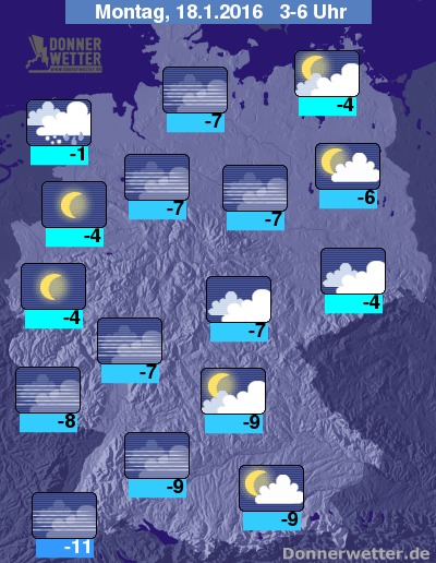 In der Nacht zum Montag ist im Nordseeumfeld gebietsweise Schnee oder Schneeregen möglich, dabei kann es glatt werden! In den östlichsten Landesteilen ist es häufig stark, teils auch aufgelockert bewölkt und überwiegend trocken. Im großen Rest des Landes ist es hingegen meist sternenklar, teils aber auch neblig-trüb, jedoch trocken. Es besteht Glättegefahr durch Rauhreifbildung! Die Temperatur sinkt auf -1 Grad in Emden und bis -11 Grad im Oberrheingraben.