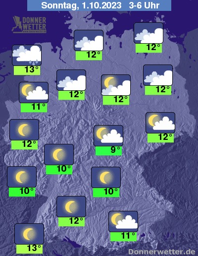 In der bevorstehenden Nacht ziehen über den Norden oft dichte Wolken hinweg, dabei kann es stellenweise auch regnen. Im Osten ist es auch teils stark, teils locker bewölkt, aber trocken. Im übrigen Land ist es verbreitet nur gering bewölkt oder sternenklar, dazu bleibt es trocken. Die Temperatur sinkt auf 13 Grad an der Nordsee und 9 Grad im Vogtland.