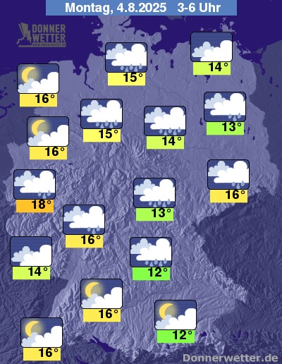 In der Nacht zum Montag bleibt es im Süden unter teils starker, teils aufgelockerter Bewölkung meist trocken. Sonst ziehen von Nordwesten her kompakte Wolken mit teils kräftigem Regen durch. Die Temperatur sinkt auf 18 Grad in Köln und bis 12 Grad in München.