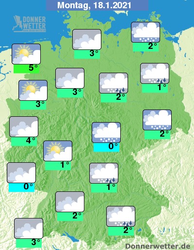 Am Montag halten sich von Bayern bis nach Brandenburg dichte Wolken und es fällt zeitweise Schnee, teils auch Schneeregen. Weiter nach Westen hin ist es oft trüb oder stark bewölkt, vor allem im Südwesten und Nordwesten zeigen sich aber auch oft heitere Abschnitte, dabei bleibt es trocken. Die Temperatur steigt auf 0 Grad im Saargau und bis 5 Grad im nördlichen Emsland.