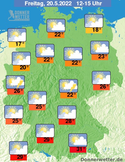 Heute Nachmittag scheint im Norden zwischen meist lockere Wolken die Sonne häufiger, sonst ist es aber überwiegend wechselnd bis stark bewölkt und über der breiten Landesmitte können sich einzelne Schauer und vereinzelt auch Gewitter entwickeln. Im übrigen Land bleibt es trocken bei 17 Grad an der Nordsee und bis 31 Grad im Berchtesgadener Land.