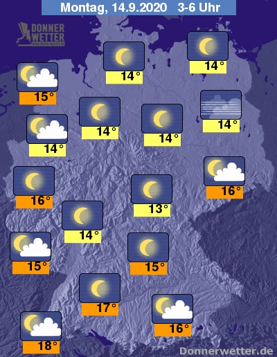 In der bevorstehenden Nacht zeigt sich der Himmel meist sternenklar, es ziehen aber auch hier und da einige, weitgehend locker bis aufgelockerte Wolkenfelder durch, dazu bleibt es trocken. Die Temperatur sinkt auf 18 Grad im Oberrheingraben und bis 13 Grad im Grabfeld.