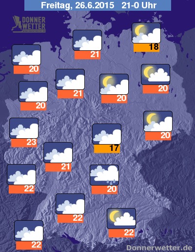 Heute Abend ziehen von Westen her zunehmend dichte Wolken auf, dabei sind gegen Mitternacht vor allem im Westen und Südwesten auch einzelne Schauer und Gewitter möglich, auch im Süden fällt bei oft dichtem Gewölk gebietsweise Regen. Im Osten und Nordosten ist es locker oder aufgelockert bewölkt und dabei weitgehend trocken.