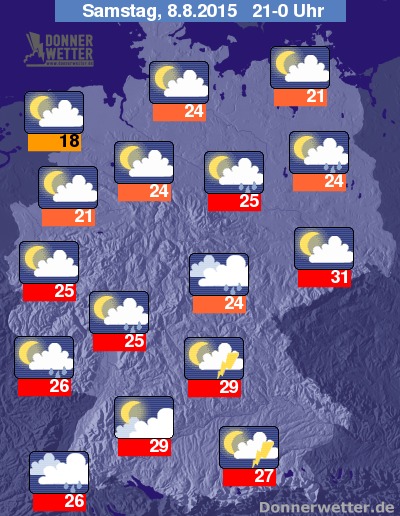 Heute Abend ist es im Norden bei lockerer oder aufgelockerter Bewölkung weitgehend trocken. Im großen Rest des Landes ist es jedoch teils stark, teils aufgelockert bewölkt und es bilden sich gebietsweise Schauer und zum Teil schwere Gewitter. Die Abendtemperatur liegt bei noch heißen 31 Grad in Leipzig und deutlich kühleren 18 Grad im nördlichen Emsland.