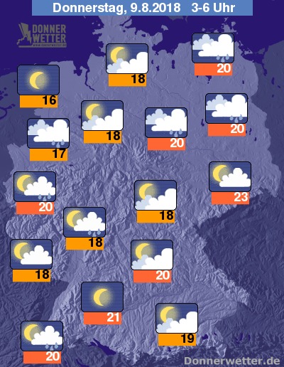 In der Nacht zum Donnerstag können sich praktisch im gesamten Bundesgebiet gebietsweise Schauer und auch teils kräftige Gewitter entwickeln, dazwischen kann der Himmel aber auch wiederholt auflockern oder auch aufklaren. Die Temperatur sinkt auf 23 Grad in Dresden und bis auf etwa 16 Grad in Bremerhaven.