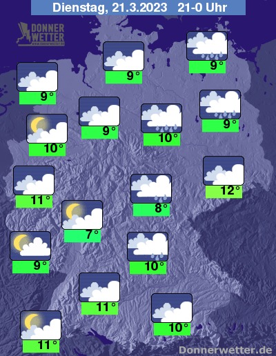 In den späteren Abendstunden ziehen die Regengebiete ost-/südostwärts weiter, so dass in der ersten Nachthälfte vor allem zwischen Ostseeküste und Franken zeitweise mit Niederschlägen zu rechnen ist. Im Westen und Südwesten gibt es in den nächsten Stunden lokal Wolkenlücken, sonst bleibt der Himmel meist bedeckt.