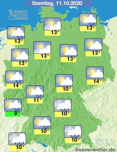 Am Sonntag ist es häufig heiter bis sonnig, vor allem im Süden ziehen aber auch verbreitet dichte Wolken durch, dabei bilden sich lokale Schauer. Im übrigen Land ist es hier und da auch mal stärker bewölkt, Schauer entwickeln sich allerdings nur selten. Die Temperatur erreicht 9 Grad am Pfälzer Wald und bis 14 Grad im Rheinland.