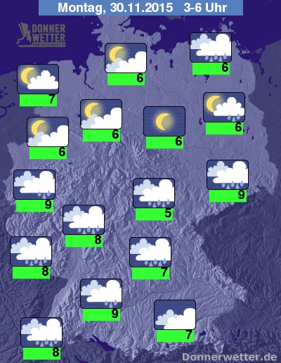 In der Nacht zum Montag lockert die Bewölkung im Norden und Westen häufig auf und der teils kräftige Regen lässt nach. Über der Südhälfte Deutschlands und vom Osten bis zum Nordosten des Landes bleibt es jedoch ebenfalls meist bedeckt und es fällt teils kräftiger und ergiebiger Regen. Die Temperatur sinkt auf 9 Grad in Stuttgart und bis etwa 5 Grad im Thüringer Becken. An der Nordsee und auf den Bergen sind weiterhin Orkanböen möglich, sonst ist es weiterhin oft stürmisch mit zum Teil schweren Sturmböen.