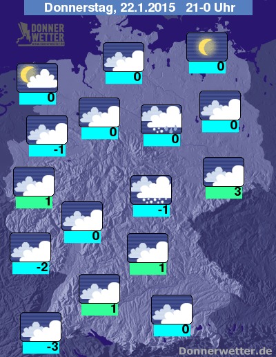 In der Nacht zum Freitag dehnen sich die Schneefallgebiete vom Osten und der Mitte Deutschlands auch in weite Bereiche der südlichen Landesteile aus, zu Beginn fällt teils auch noch Schneeregen oder Regen, dazu besteht Glättegefahr. Auch in der Nordwesthälfte des Landes bleibt die Bewölkung häufig dicht, besonders im Nordwesten kann es aber auch häufig aufklaren. Es bleibt trocken. Die Temperatur sinkt auf 2 Grad in Dresden und bis -4 Grad am Bodensee.