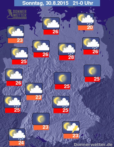 Heute Abend ziehen vor allem im Nordosten und im Süden von Deutschland oft dichte Wolken auf, die zu teils kräftigen Schauern und Gewittern führen. Sonst ist es verbreitet nur locker, im Norden und Nordwesten zum Großteil aufgelockert bewölkt, aber dabei trocken. Von der Landesmitte bis in den Osten der Republik zeigt sich ein verbreitet sternenklarer Himmel und auch hier bleibt es trocken. Die Abendtemperatur liegt bei schwülwarmen 28 Grad in Magdeburg und etwa 20 Grad in Vorpommern.