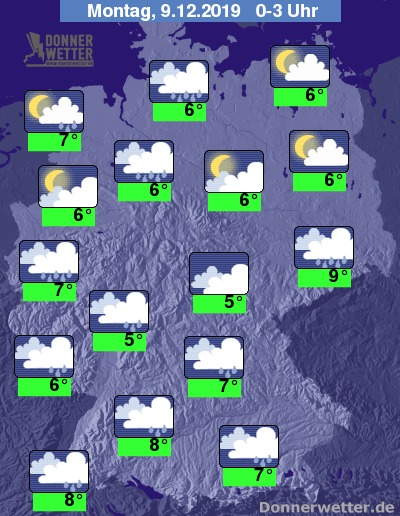 In der Nacht auf Montag bleibt die Wolkendecke über weiten Teilen des Landes geschlossen, Auflockerungen beschränken sich in den nächsten Stunden vor allem auf den Norden und Osten Deutschlands. Hier bleibt es zudem überwiegend trocken, in den übrigen Landesteilen muss dagegen immer wieder mit Regen gerechnet werden, der im Südwesten auch als Schneeregen fallen kann. Der Wind weht weiterhin frisch bis stürmisch.