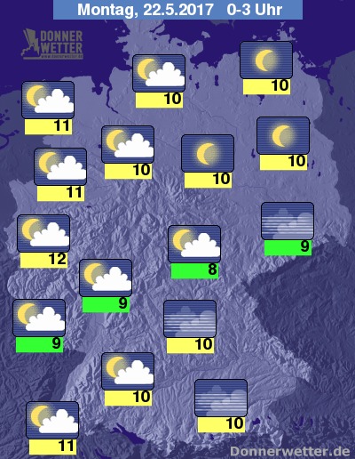 In der Nacht von Sonntag auf Montag ist der Himmel fast überall leicht bewölkt. Im Südosten breitet sich in machen Orten Nebel aus.