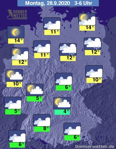 In der folgenden Nacht fällt von Berlin-Brandenburg bis nach Sachsen-Anhalt unter dichten Wolken zeitweise Regen. Im übrigen Land ist es auch oft stark, teils aber auch nur locker bis aufgelockert bewölkt, dazu bleibt es trocken. Die Temperatur sinkt auf 14 Grad an den Küsten und bis 4 Grad in Unterfranken.