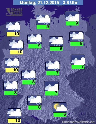 In der bevorstehenden Nacht bleibt es im Südosten Deutschlands bis zum Morgen noch weitgehend aufgelockert oder locker bewölkt und dazu trocken. In den anderen Landesteilen ziehen hingegen dichte Wolken durch und es fällt immer wieder Regen. Im Nordwesten und im äußeren Norden klingen die Niederschläge gegen Morgen meist ab und hier und kann es auch mal auflockern. Die Temperatur sinkt auf 10 Grad am Niederrhein und bis 6 Grad in Rosenheim.