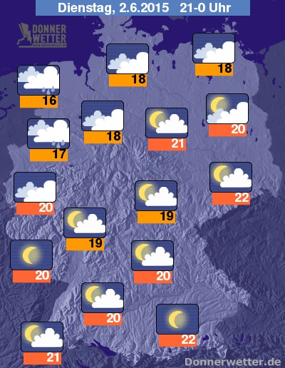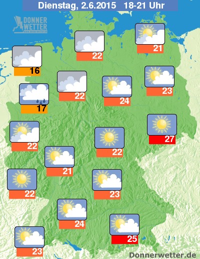 Unter dichten Wolken liegt der Nordwesten Deutschlands auch am Dienstagabend, dazu kann es ab und an auch mal einen Schauer geben. Nach wie vor freundlich und trocken zeigt sich dagegen der Rest des Landes. Die Temperaturen liegen am Abend bei Werten um 16 bis 27 Grad C.