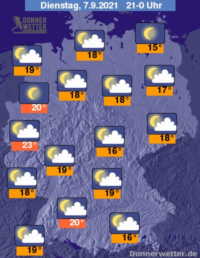Die Temperaturen liegen am späteren Abend noch bei Werten um 22 bis 28 Grad, bis Mitternacht zurückgehend auf milde 23 bis 15 Grad.